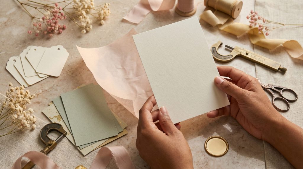 A gramatura refere-se à espessura do papel. Para papelaria de festa, papéis finos (como o sulfite comum de 75g ou 90g) devem ser evitados, pois não sustentam a estrutura de caixas ou tags.