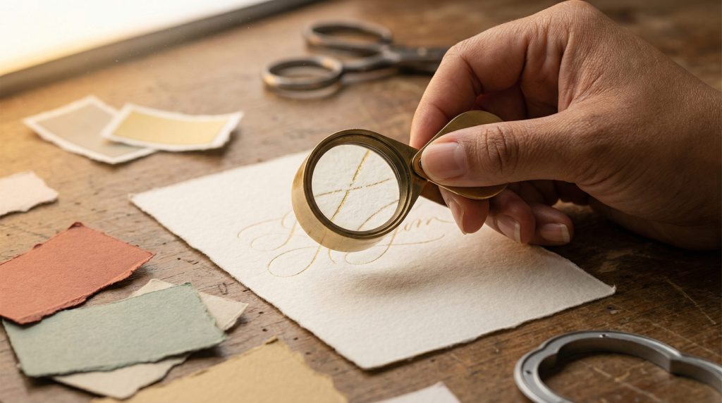 A “gramatura” refere-se à espessura e densidade do papel. Para convites e tags que precisam de firmeza, papéis abaixo de 180g não são recomendados, pois dão uma sensação de fragilidade.