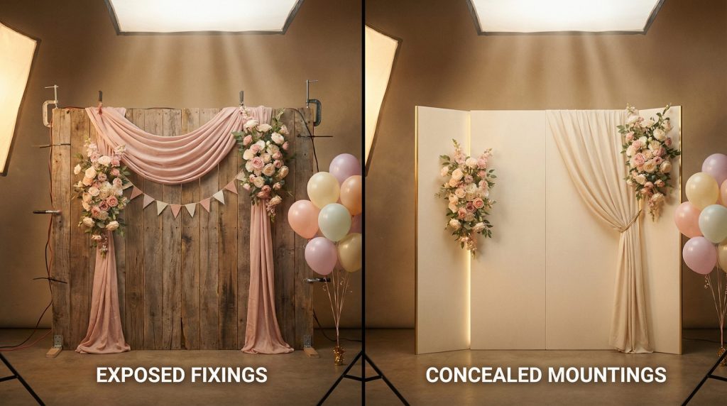 A beleza de um painel não pode comprometer a segurança. Estruturas autoportantes de ferro ou madeira são essenciais, especialmente em locais onde não é permitido furar paredes. O uso de pesos adequados (sacos de areia camuflados ou bases de ferro maciço) é obrigatório, principalmente em eventos ao ar livre sujeitos a ventos. A técnica de “envelopamento” da estrutura deve ser feita de forma que o tecido fique perfeitamente esticado, sem rugas que denunciem o amadorismo na montagem.