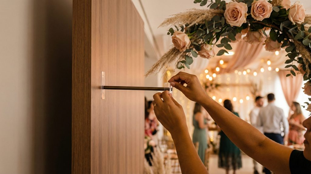 A beleza nunca deve se sobrepor à segurança. Elementos suspensos representam um risco real se não forem fixados corretamente. É imperativo verificar os pontos de ancoragem do salão e o peso dos materiais. Além da queda, o material utilizado deve ser considerado.