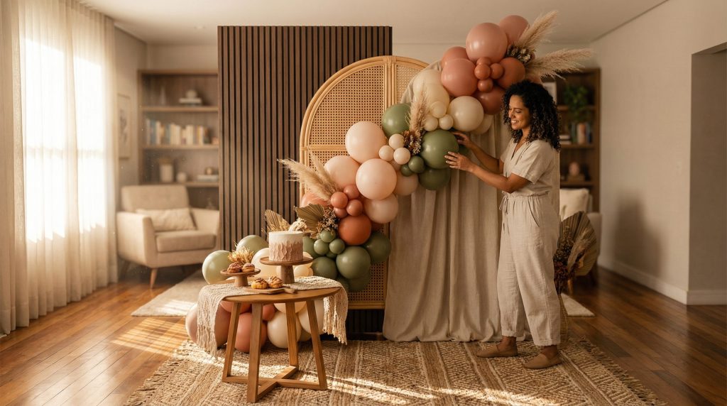 Além disso, as tendências de design de interiores influenciam diretamente o mercado de festas. Assim como o G1 (Vilarejo) aponta que o verão de 2026 aposta em tons neutros e texturas orgânicas para criar ambientes elegantes em residências, essa estética migrou para os painéis de festas. O uso de fibras naturais, palha, linho e tons terrosos nos fundos decorativos traz uma sofisticação atemporal, fugindo das cores saturadas tradicionais e proporcionando um visual mais leve e “brençoso”.