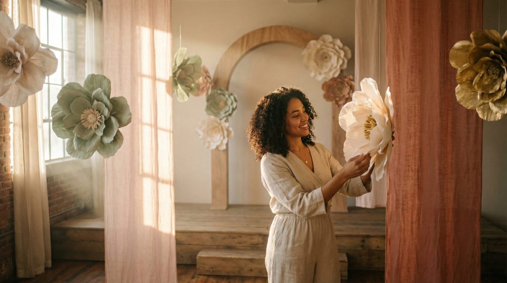 Por fim, a tendência global aponta para a redução de resíduos. Investir em acervos duráveis, como painéis de madeira de reflorestamento, flores permanentes de alta qualidade (silicone ou tecido nobre) e evitar plásticos de uso único é fundamental. A criatividade permite transformar materiais recicláveis em luxo, alinhando a estética da festa com a consciência ambiental necessária nos dias de hoje.