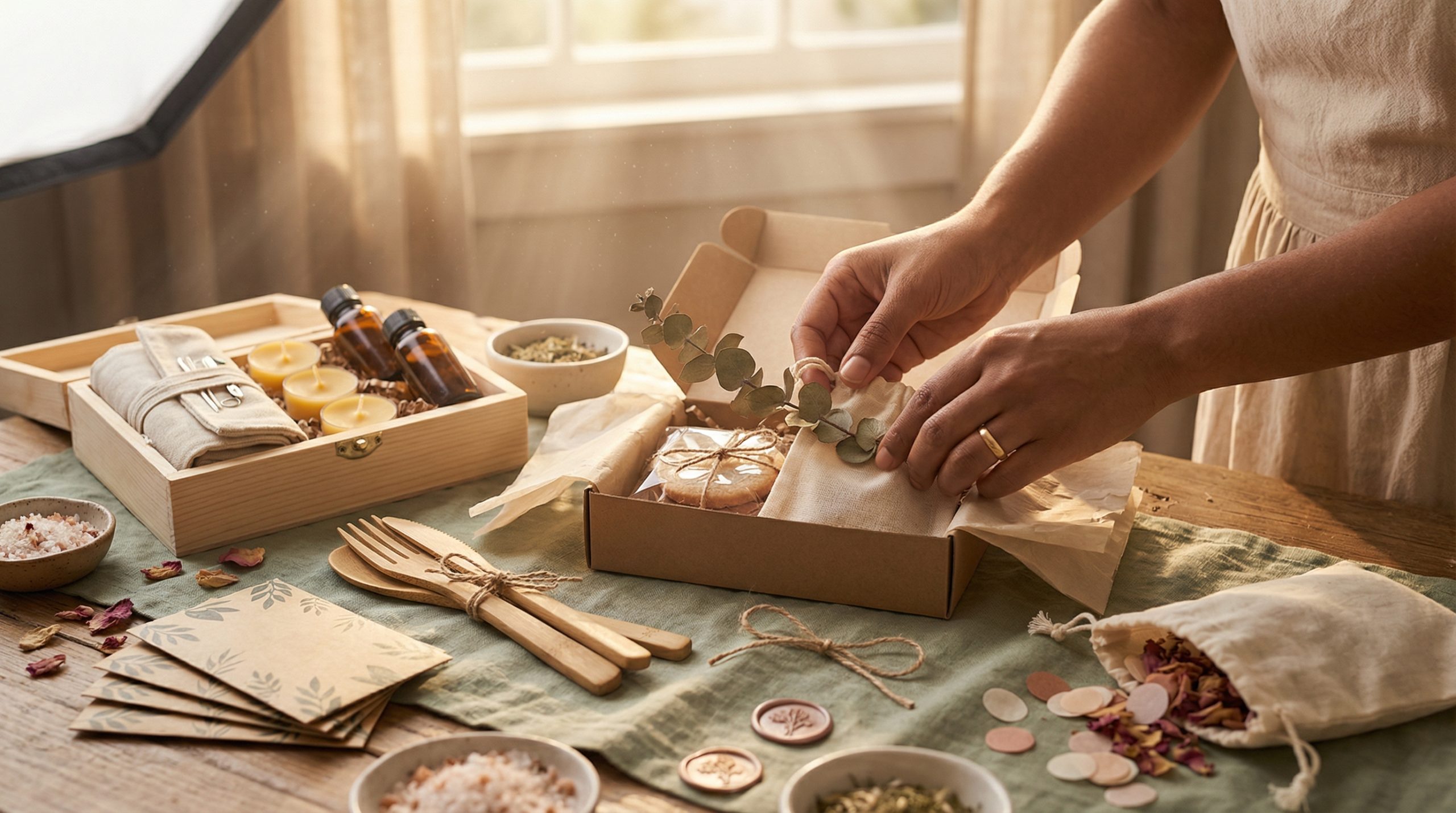 Para eventos como despedidas de solteira, dia das mães ou eventos corporativos focados em saúde, os kits de spa são ideais. Eles podem conter mini sabonetes artesanais, sais de banho, hidratantes labiais e máscaras de dormir. A apresentação em cestas de vime ou caixas de madeira leve reforça a mensagem de relaxamento e cuidado pessoal.