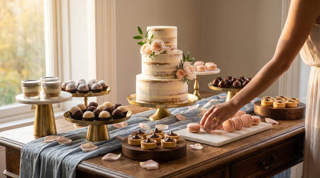 A natureza do evento ditará o estilo da mesa. Em recepções menores ou jantares, a tendência da “mesa posta” integra os doces como parte da experiência de servir, muitas vezes utilizando aparadores auxiliares. Já o “cantinho do bolo” é uma solução excelente para espaços compactos, onde a verticalização é essencial.