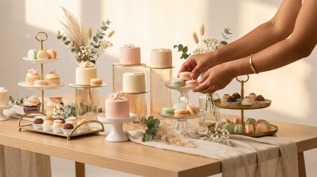 Não tenha medo de sobrepor elementos. Uma bandeja pode estar apoiada diretamente na mesa, enquanto outra, logo atrás, está elevada por um suporte de pedestal. Isso otimiza o espaço, permitindo colocar mais doces em uma área menor, e enriquece a fotografia. Lembre-se apenas de garantir a estabilidade de todas as peças para evitar acidentes durante o evento.