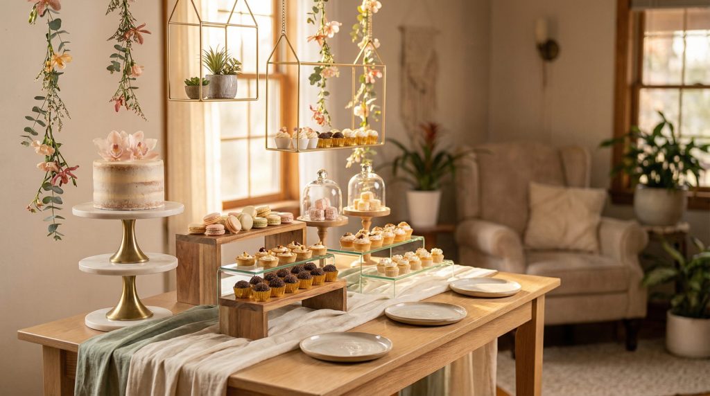 Para apartamentos ou salões pequenos, a verticalização é a chave. Utilize estantes, escadinhas decorativas ou carrinhos de chá para dispor os doces. O “Cantinho do Bolo” pode ser apenas uma mesa redonda pequena, bem decorada, focada na qualidade e não na quantidade. Outra opção é a mesa desconstruída, usando cômodas ou móveis da própria casa para criar um ambiente acolhedor e com memória afetiva, provando que não é preciso um espaço enorme para celebrar com estilo.